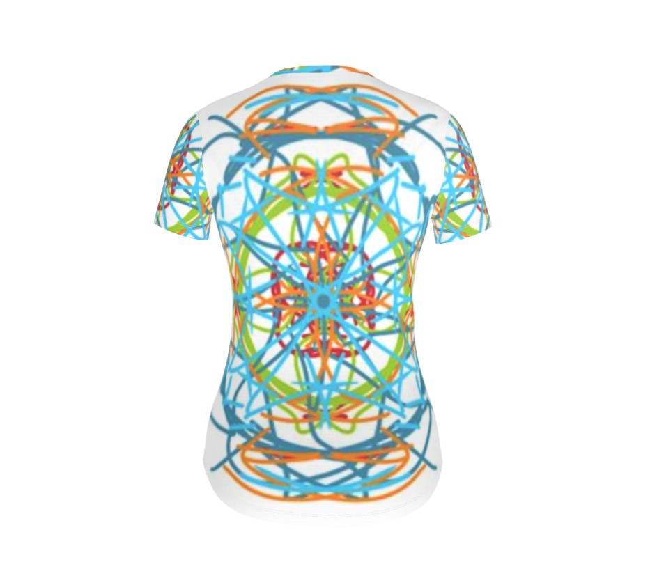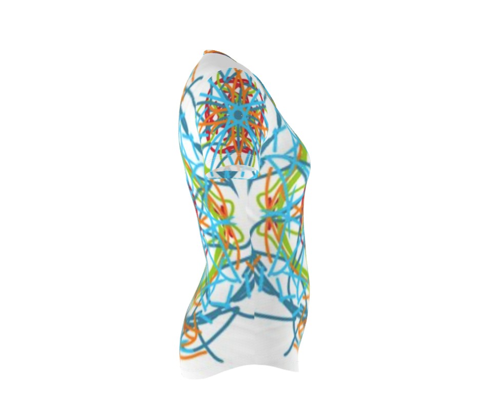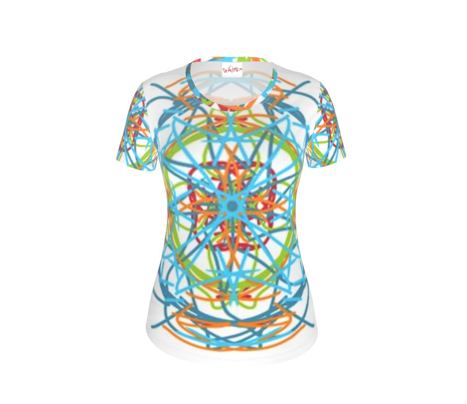 Our Handmade short sleeve ladies fitted Top in our Wheels Within Wheels illustration.